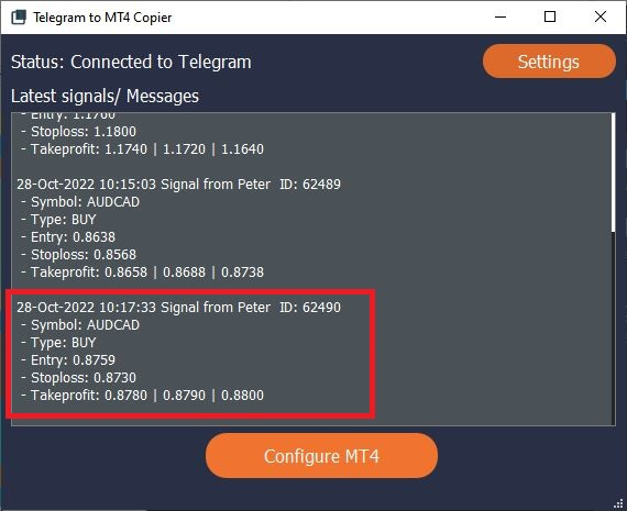 This piece of information tells us that we have received a signal from Peter on 28-Oct-2022 at 10:17:33 and the ID assigned to this signal is 62490. Also the currency pair, operation,entry, stop-loss and take-profit prices are detected properly. Lets see how they have opened the trades in your MT4 platform.
