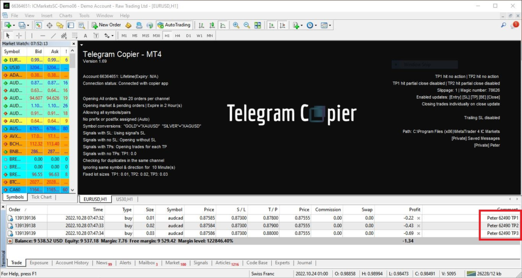 Three trades have opened for the signal correctly. The default setting of the copier is set to open trades for each take-profit level in the signal. Notice the order comments in the bottom right corner(highlighted with the red box).
